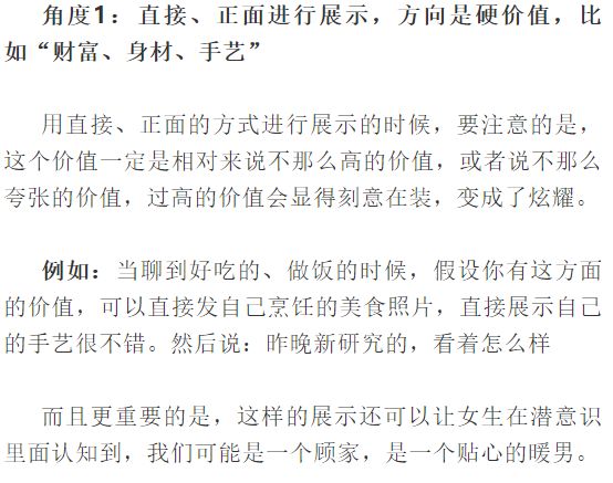 角度2:侧面的进行展示,方向是软价值,比如“有追求、有品位、有上进心”? 用侧面的方式进行展示的时候,我们可以更好的展示自己的软价值,也就是呼应文章开头提到的,为了让女生在刚认识我们的时候,她就会觉得,我们具备或满足她的一个潜在对象的形象,或者说,让女生在意识上会觉得我们是一个“优质”的男人。